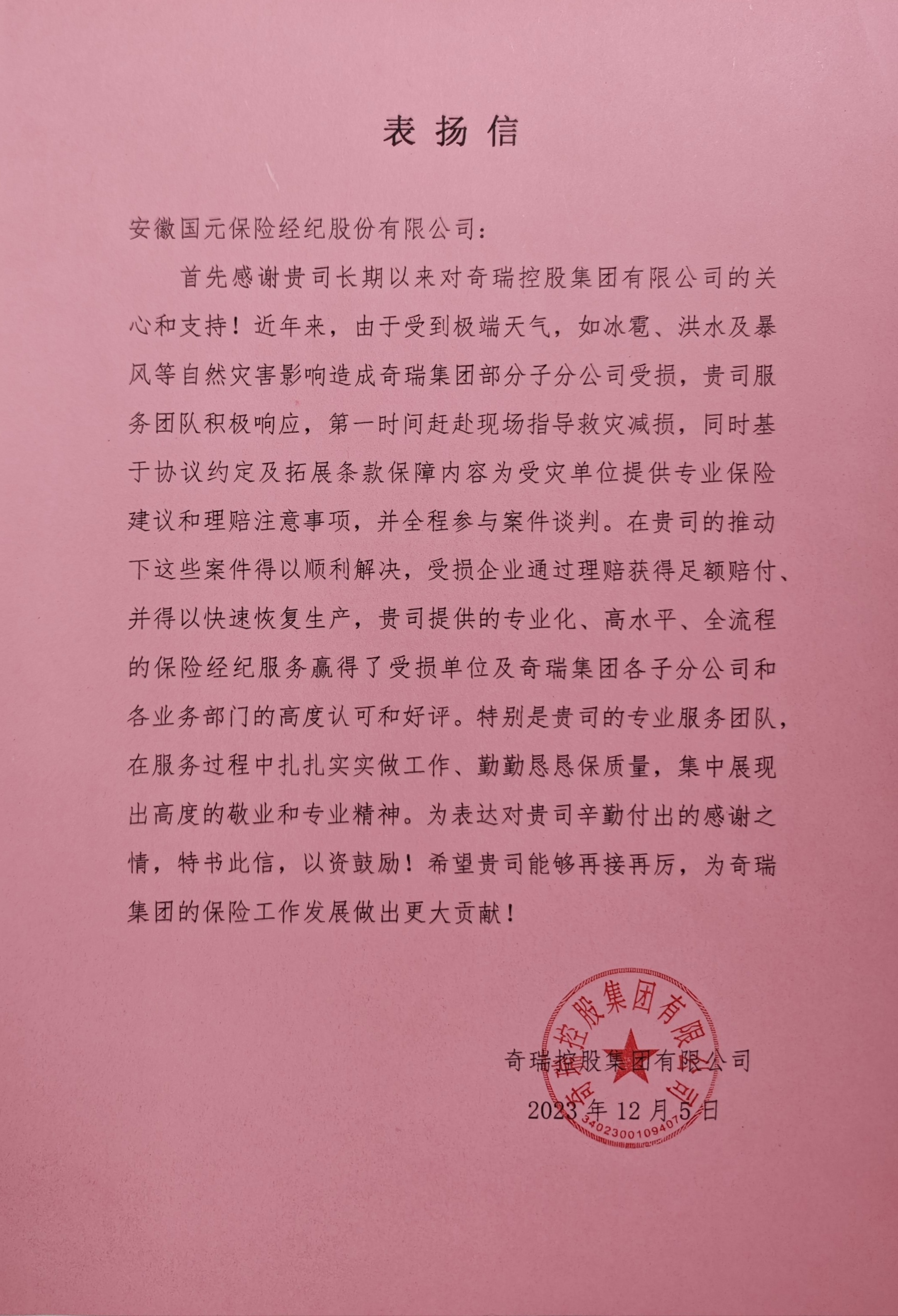 奇瑞集團(tuán)在表揚(yáng)信中特別提到,國元保險(xiǎn)經(jīng)紀(jì)在服務(wù)過程中扎實(shí)工作,勤勉盡責(zé),展現(xiàn)出高度的敬業(yè)和專業(yè)精神,贏得了受損單位、奇瑞集團(tuán)各子分公司及各業(yè)務(wù)部門的高度認(rèn)可和好評(píng)。